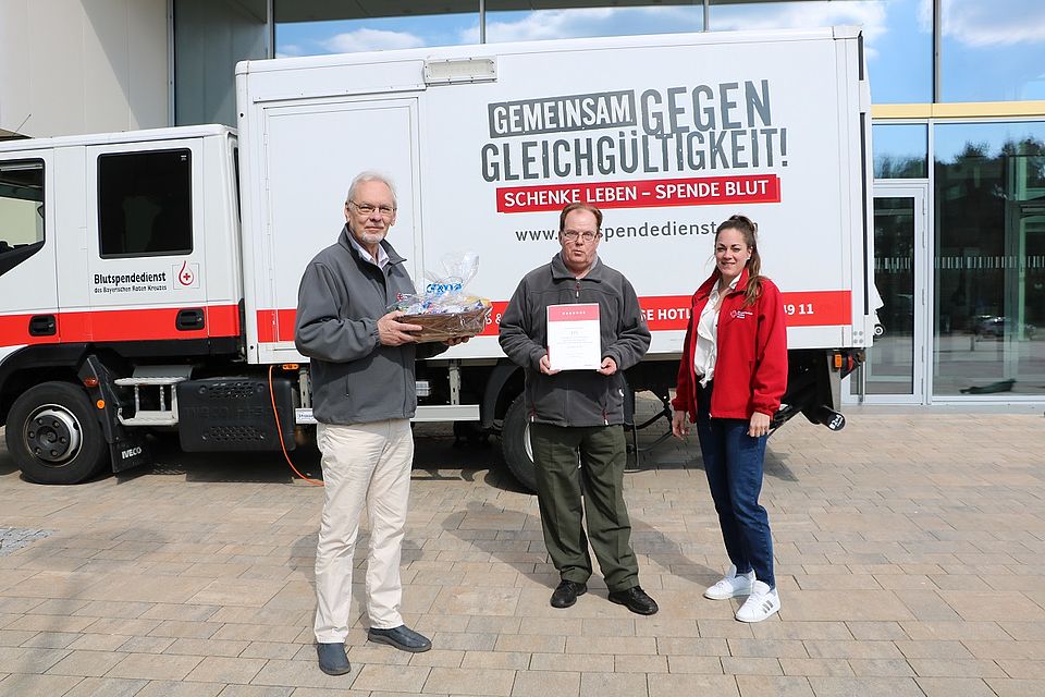 Nora Ulbrich vom BRK Service-Team Weißenburg und Jochen Strauß, Beauftragter für das Blutspenden in der BRK-Bereitschaft Hilpoltstein, nutzen die Gelegenheit, um dem Jubiläumsspender bei seiner jüngsten Spende in der Aula des Hilpoltsteiner Gymnasiums mit einem kleinen Präsent für sein selbstloses und uneigennütziges Engagement zugunsten schwerkranker Mitmenschen zu danken.