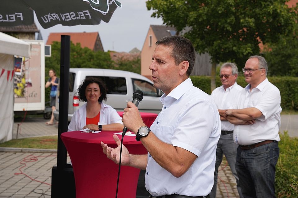 Bewohner, Angehörige und Mitarbeitende konnten bei bestem Sommerwetter und guter Stimmung den Nachmittag genießen. Dafür sorgte auch Otto Schmidtpeter mit seinem Akkordeon, er spielte zu Kaffee und Kuchen auf. Im Festzelt vor dem Seniorenhaus konnte Einrichtungsleiterin Tina Albrecht auch Landrat Ben Schwarz, Bürgermeister Ralf Beyer und Stadtpfarrer Sebastian Lesch begrüßen. Aus der BRK-Familie waren stv. Vorsitzender Ernst Hofer, Geschäftsführer Rainer Braun sowie die beiden Stellvertreter Martin Fickert und Johannes Wetzel dabei.