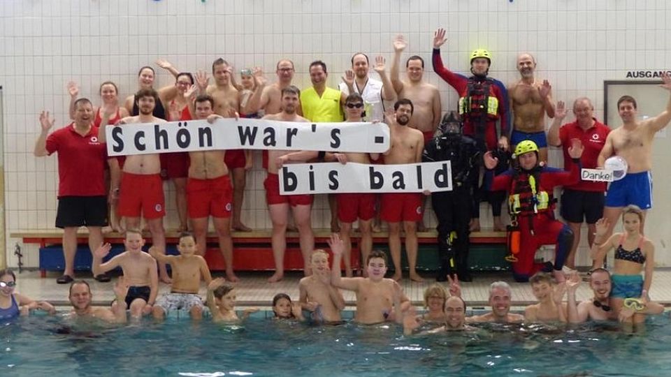 Beim Abschwimmen darf natürlich auch die Wasserwacht, einer der Hauptnutzer der Einrichtung, nicht fehlen. Einige haben sich sogar extra für diesen Anlass in den Neoprenanzug gezwängt oder sind gar in kompletter Tauchausrüstung erschienen. Für die Wasserretter bedeutet die Schließung des Bades einen erheblichen Einschnitt. Zum Schwimmtraining müssen die Kinder und Jugendlichen nun bis auf weiteres nach Neuendettelsau ausweichen, die Erwachsenen fahren nach Gunzenhausen. Neben dem erhöhten Zeitaufwand kommen damit auch zusätzliche Kosten auf die Ortsgruppe zu. Dass der eine oder andere der aktuell knapp über 500 Mitglieder die Segel streicht, werde sich angesichts dessen wohl kaum vermeiden lassen. Diesen Aufwand müsse man jedoch betreiben, heißt es seitens der Wasserwacht, allein schon, um den Seedienst in Allmannsdorf aufrecht erhalten zu können. Apropos Wasserwacht: Dass der Schwimmbetrieb überhaupt bis Weihnachten aufrechterhalten werden kann, ist einigen besonders engagierten Wasserrettern zu verdanken. Nachdem sich der langjährige Bademeister Joachim Stöckel im Herbst in den Ruhestand verabschiedet hat, übernahmen sie die Aufsicht im Bad.