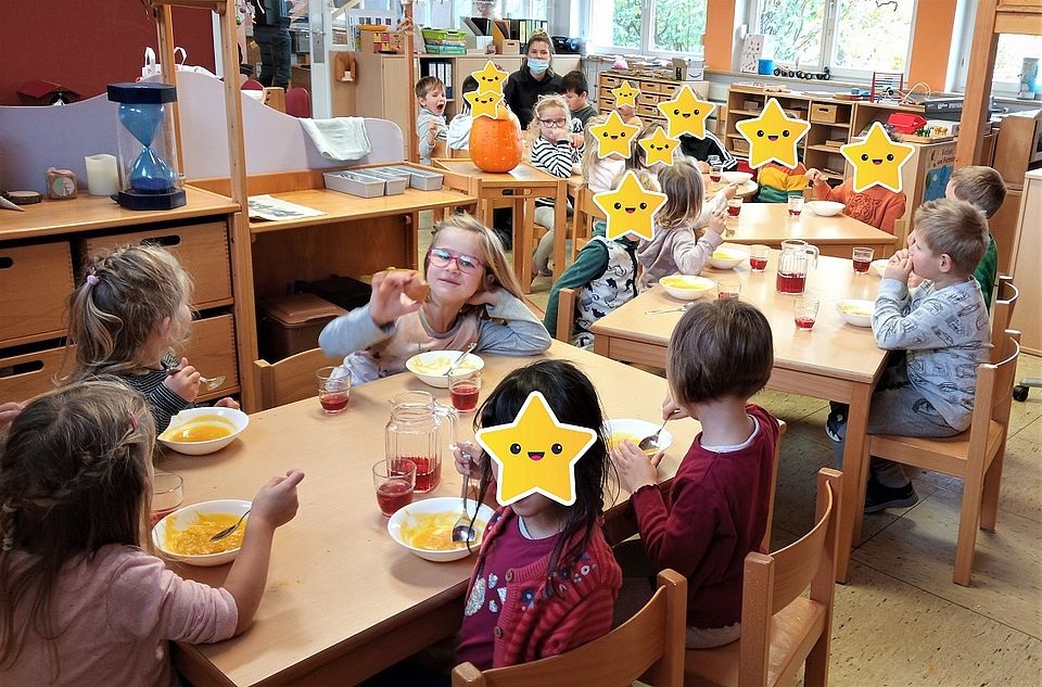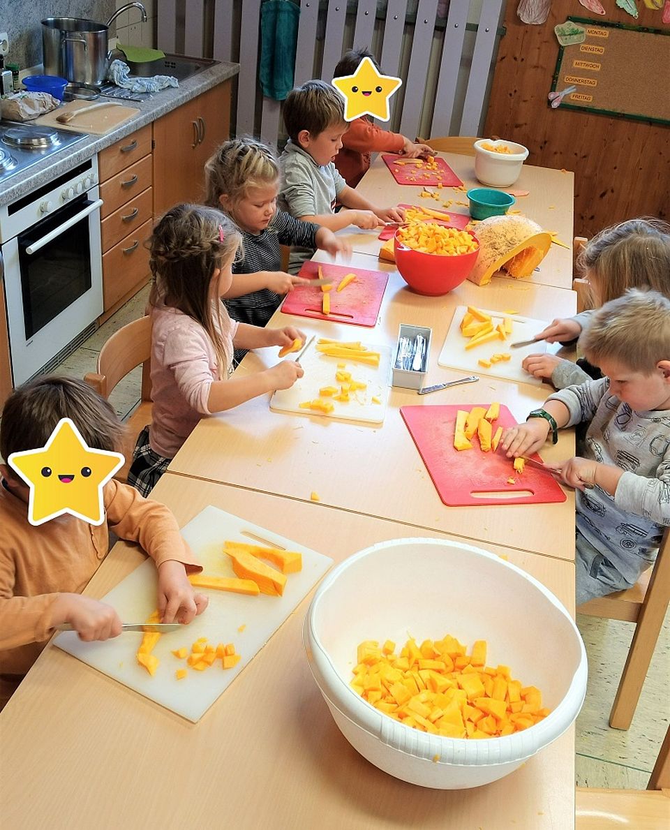 Der Kürbis wird in der Mitte geteilt und das weiche Innenleben erkundet. Wer möchte darf sich Kürbiskerne mit nach Hause nehmen. Mit großem Eifer und sehr viel Ausdauer und Konzentration wird geschnitten und geschnitten - jeder hilft mit! Kürbis, Kartoffeln, Zwiebeln und Äpfel alles wandert in die großen Töpfe. Es dampft und brodelt, es wird gerührt, pürriert und abgeschmeckt. Der Duft zieht durch das ganze Haus und einjeder ist gespannt wie es schmeckt.