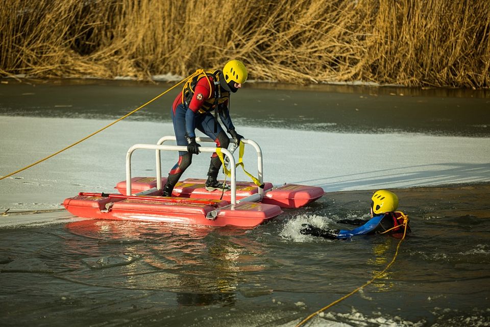 Wenn ein Eisunfall beobachtet wird, muss der Hilferuf sofort weiter gegeben und eine schnelle Rettung organisiert werden, da jede zusätzliche Minute im kalten Wasser die Kräfte des Patienten massiv mindert. Unter der Notrufnummer 112 können Wasserwacht, Rettungsdienst und Notarzt angefordert werden. „Der Anrufer sollte bewusst darauf hinweisen, dass es sich um einen Eisunfall handelt und alle W-Fragen beantworten: Wo ist etwas passiert? Was ist passiert? Wie viele Verletzte gibt es? Welche Arten von Verletzungen? Am Ende des Gesprächs sollte er auf jeden Fall auf Rückfragen warten und nicht auflegen“, erklärt Köhler. Durch die starke Unterkühlung wird die Beweglichkeit des Betroffenen eingeschränkt. Es droht der Tod durch Erfrieren und Ertrinken. Ersthelfer sollten dem Betroffenen Mut zusprechen und ihn zum Durchhalten animieren.
