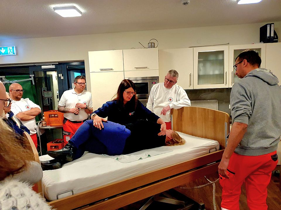 Im Anschluss stand die praktische Umsetzung im Fokus: Die Einsatzkräfte konnten verschiedene Techniken zur schonenden Lagerung und Mobilisierung unter realitätsnahen Bedingungen erproben. Hierfür standen unter anderem ein Pflegebett des Seniorenhauses, ein Disc-O-Pflegebett sowie Feldbetten zur Verfügung. Zusätzlich wurden unterschiedliche Möglichkeiten der Nahrungsaufnahme getestet – eine Übung, bei der neben dem Lerneffekt auch der Spaß nicht zu kurz kam.