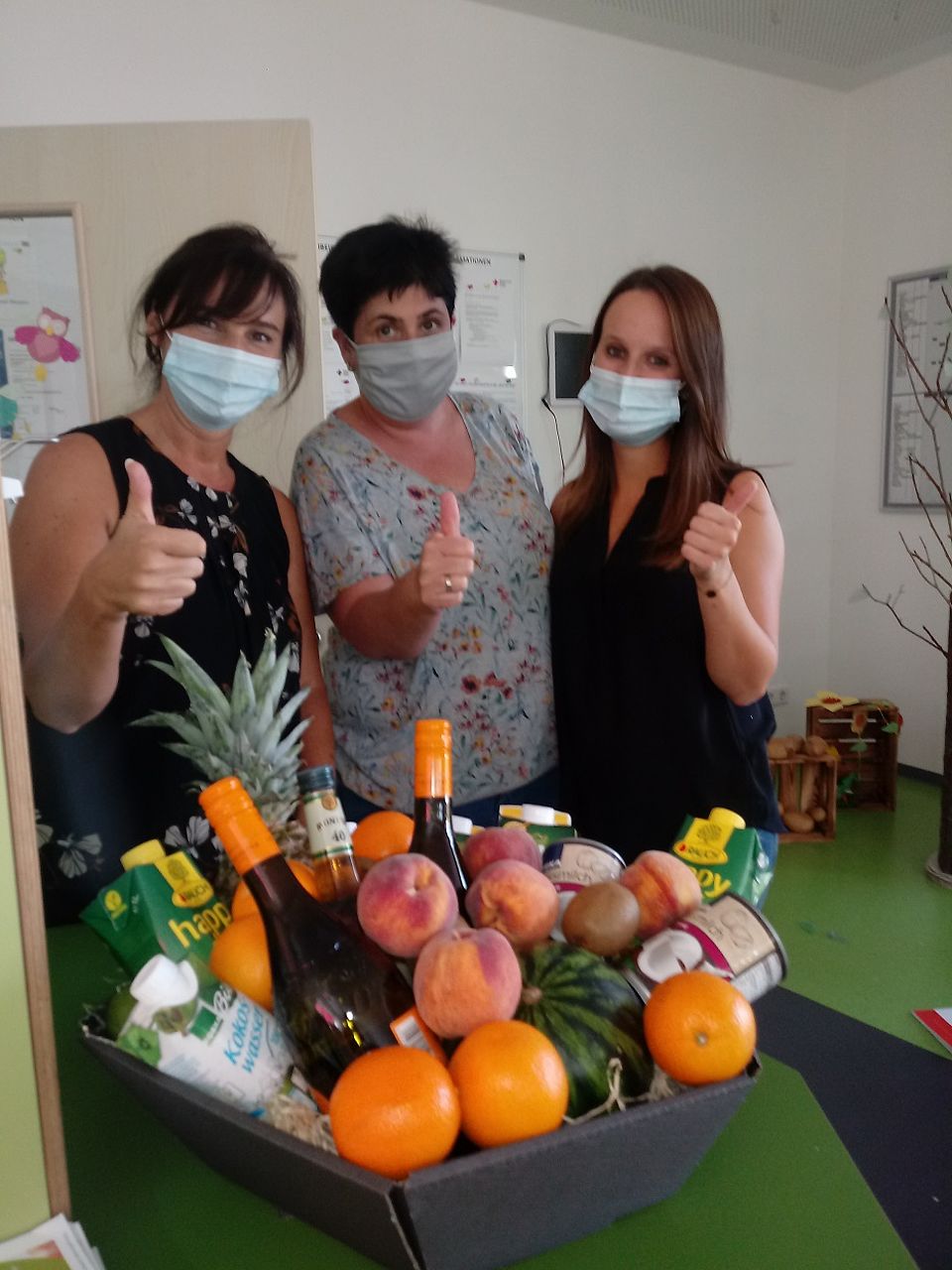 „Den Sommer nochmal zurückholen“ war das Motto des Preises. Südfrüchte und die Zutaten für einen erfrischenden Sommercocktail kamen bei den Damen der Einrichtung gut an. „Der Präsentkorb ist für unser Team gefühlt wie ein Tag Urlaub“, strahlt Annett Weich, Leitung der KiTa und freut sich über die Anerkennung, die für sie viel mehr ist als der Preis für einen Wettbewerb. „Für uns ist das vor allem ein Zeichen der Wertschätzung und ein positiver Gegensatz zu den Herausforderungen dieses Jahres“, so Weich weiter. „BRK-Familie eben…“