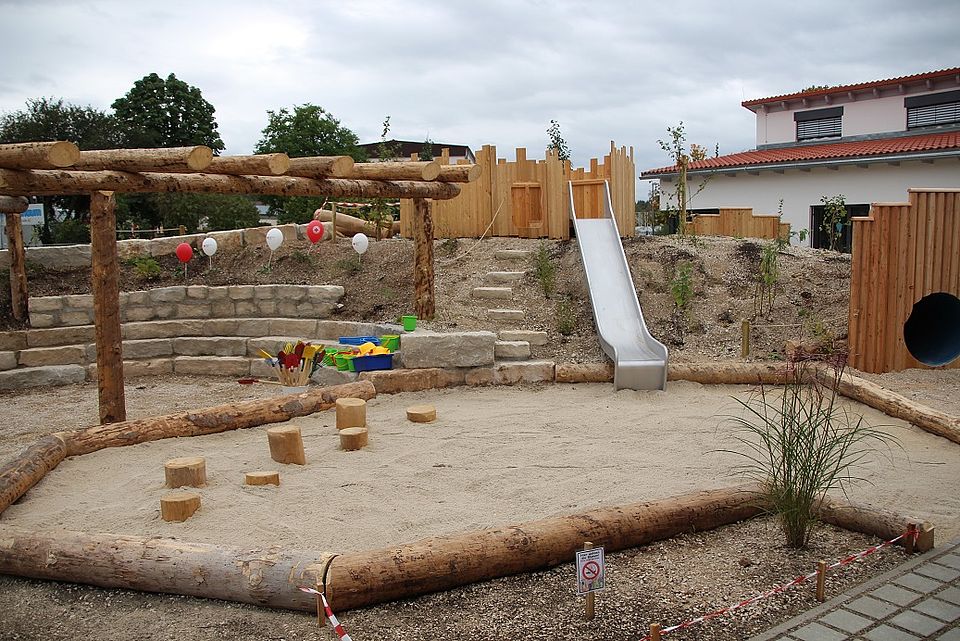Besonders stolz ist man beim BRK auf den von Birgit Helbig geplanten naturnahen Garten. Dieser wird den Kindern zahlreiche Möglichkeiten bieten, ihrer Phantasie und Kreativität freien Lauf zu lassen. Durch die unterschiedlichen Höhen und Tiefen sowie die verschiedenartig verwendeten Materialien (Sand, Steine, Erde und Holz) können Kleinen ihren Bewegungs- und Entdeckerdrang optimal ausleben.