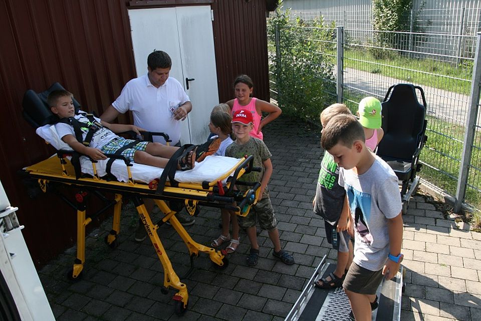 In verschiedenen Stationen konnten die Kinder zunächst die Versorgung von Wunden und die „stabile Seitenlage“ erlernen und Üben. Anschließend wurden ihnen die Einrichtung und Gerätschaften eines Krankenwagens erläutert. Hierbei durften alle auf der Krankentrage „probeliegen“ und sich von den anderen Teilnehmern ein Stück auf dem Tragestuhl hin und herfahren lassen.