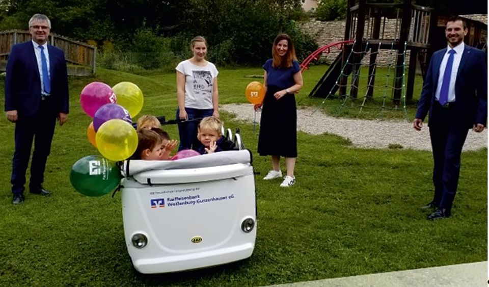 Überreicht wurde der Kinderbus von Marktbereichsleiter Stefan Biber und Kundenberater Norbert Mittermeier von der Raiffeisenbank Weißenburg-Gunzenhausen. Beide wünschen allen Kindern und Erzieherinnen allzeit gute Fahrt!