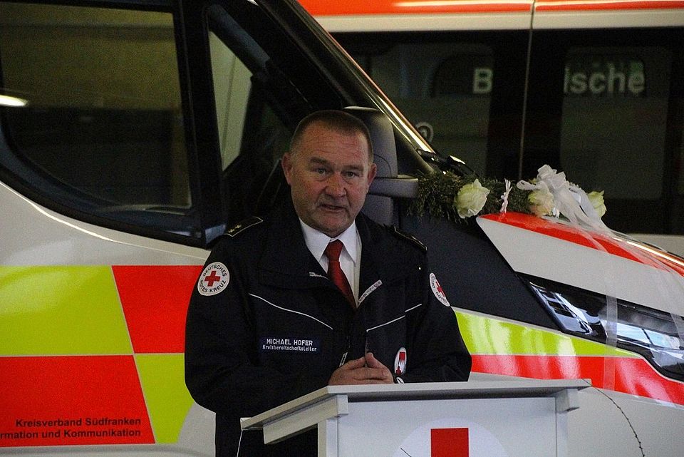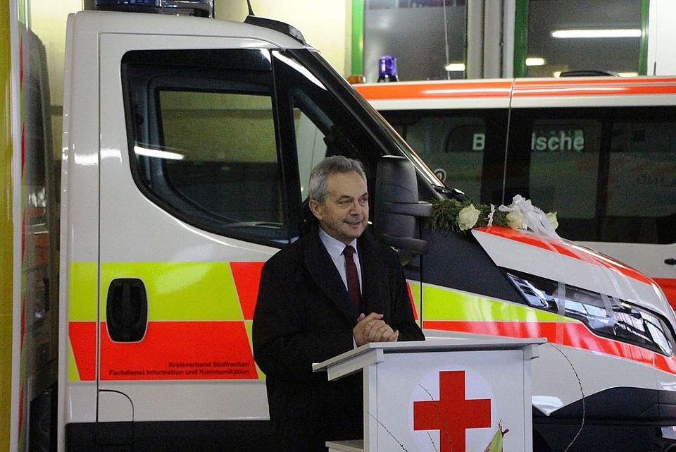 Dominik Bauer, stellvertretender Kreisbereitschaftsleiter und selbst Mitglied im Fachdienst Information und Kommunikation skizzierte nochmals den Entstehungsprozess des neuen Fahrzeugs, angefangen von ersten Planungen im Jahr 2017 bis zur Abholung des fertigen Fahrzeugs Anfang Februar in Forchheim. Er stelle heraus, dass die Beschaffung ohne Förderprogramm des Freistaats nicht möglich gewesen wäre und hob insbesondere die hervorragende Zusammenarbeit mit der Firma Compoint als Generalunternehmer hervor.