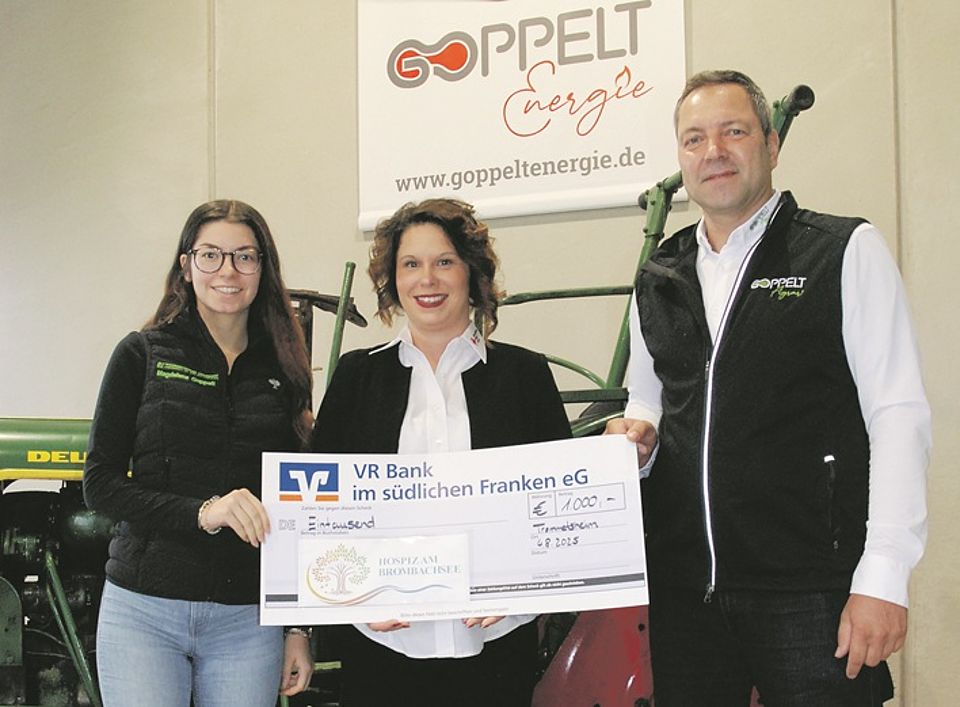 Anlässlich der Jubiläumsfeier kam bei einer Spendenaktion ein Geldbetrag zusammen, den Familie Goppelt großzügig auf 1000.- € aufstockte und nun an die Projektleiterin Tina Müller für den Bau „Hospiz am Brombachsee“ übergab. Unter der Trägerschaft des BRK Kreisverbandes Südfranken soll am Ufer des Brombachsees, nähe Pleinfeld, das Hospiz entstehen. Spatenstich ist für den 9. Oktober 2025 geplant.