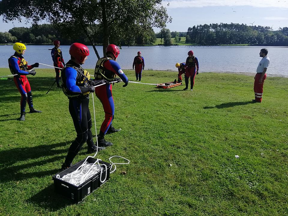 Außerdem gab es noch viele Stationen zum Thema Schnelleinsatzgruppe: Wie suche ich an Land? Wie im Wasser? Wie verhalte ich mich bei einem Eiseinbruch und vielen anderen Themen. Mit dem erfolgreichen Abschluss des Wasserretters ist auch die Grundausbildung abgeschlossen und die Teilnehmer sind Mitglied der Schnelleinsatzgruppen der Ortsgruppen. Motiviert übte unsere Truppe täglich von 8 bis 19 bzw 18 Uhr, damit sie am nächsten Wochenende erfolgreich ihre Prüfung bestehen können. Neben den fachlichen Input ging es auch darum die Führung einer Truppe zu übernehmen, die ganze Organisation um einen Einsatz herum und das Arbeiten in Trupps. Durch die Anwesenheit unseres Einsatzleitautos konnten die Einsätze wie in der Realität koordiniert werden. Die Teilnehmer mussten ihren Status mittels Funkgerät übermitteln, Rückmeldungen abgeben und erhielten auch so ihre Aufträge.