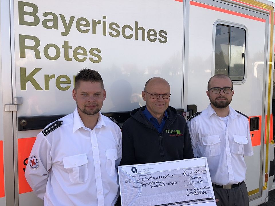 Überraschung beim Tag der offenen Tür der BRK Bereitschaft Pleinfeld. Peter Gallenmüller überreichte im Namen der „Alte Post-Apotheke“ einen Scheck über 1.000 EUR an die Rotkreuzler. Gallenmüller und seine Frau Bettina wollen damit den engagierten Pleinfelder Sanitätern für deren unermüdlichen freiwilligen Einsatz zugunsten der Bevölkerung in der Rezatgemeinde danken.