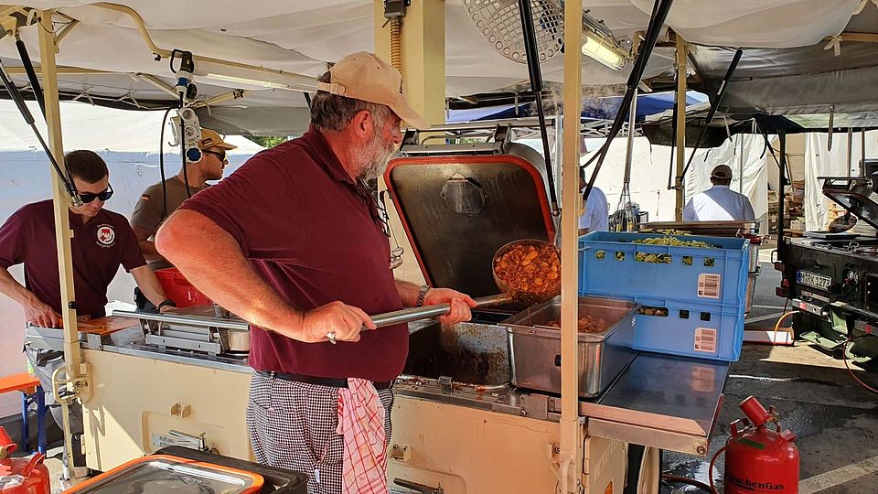 Aus bis zu 11 Feldküchen werden dort die Anwohner und Einsatzkräfte im 65 Kilometer langen Ahrtal mit Essen versorgt.