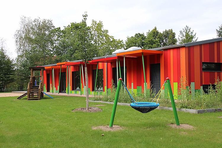 Unsere Einrichtung befindet sich auf dem Firmengelände der Firma Luxhaus im Gewerbegebiet Georgensgmünd, inmitten eines bewaldeten Grundstücks mit vielen Bäumen, Sträuchern und Hecken.