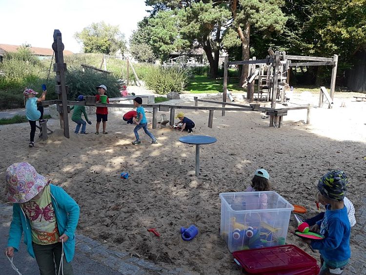 Die großzügige Außenanlage bietet eine vielseitige Auswahl zum Toben, Matschen, Sand spielen, Schaukeln, Klettern und noch viele tolle Sachen mehr. Eine weitere Besonderheit sind die vielen Tiere, welche in ihren Freigehegen beobachtet und manche auch gestreichelt werden können (z.B. Esel, Ziegen, Pferde, Hühner, Alpakas, Hasen, Bienen und Gänse).