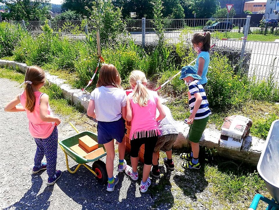 Hand in Hand wurden Steine transportiert, aufeinandergestapelt und vermörtelt. Die Kinder bewiesen, dass sie trotz reduzierter sozialer Kontakte während des Lockdowns ihre Kooperationsfähigkeit nicht verloren haben. Viel Kraft, Ausdauer, ein harmonisches Miteinander (und ein Spielzeugtraktor) haben zum guten Gelingen des ersten Bauabschnitts beigetragen.
