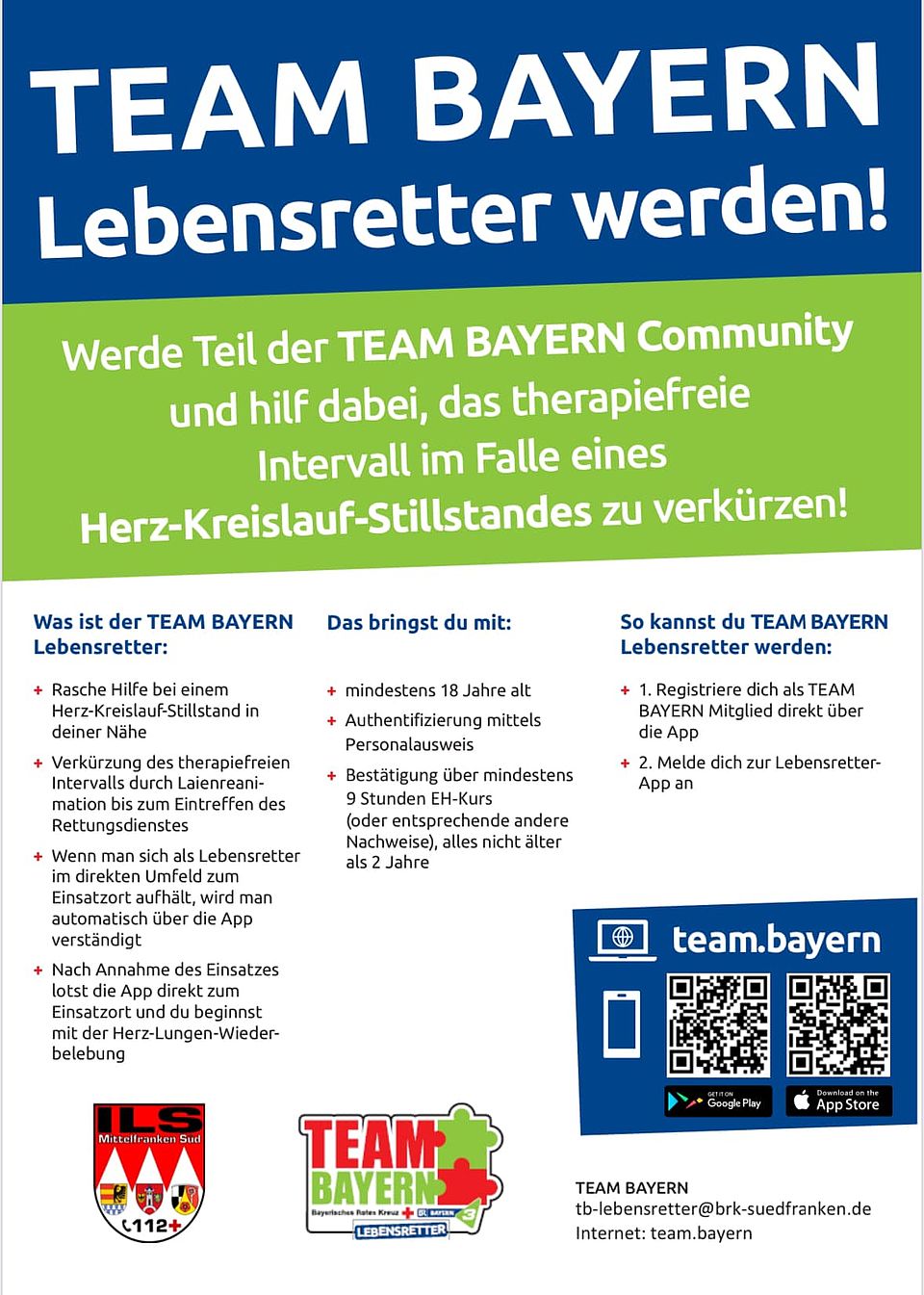 Jeder, der mindestens 18 Jahre alt ist und einen Erste-Hilfe-Kurs oder eine höherwertige medizinische Ausbildung absolviert hat, kann sich als Ersthelfer registrieren. Die App ist kostenfrei im App Store und bei Google Play erhältlich. Für weitere Informationen über das TEAM BAYERN Lebensretter steht Ihnen der BRK Kreisverband Südfranken unter tb-lebensretter@brk-suedfranken.de zur Verfügung.