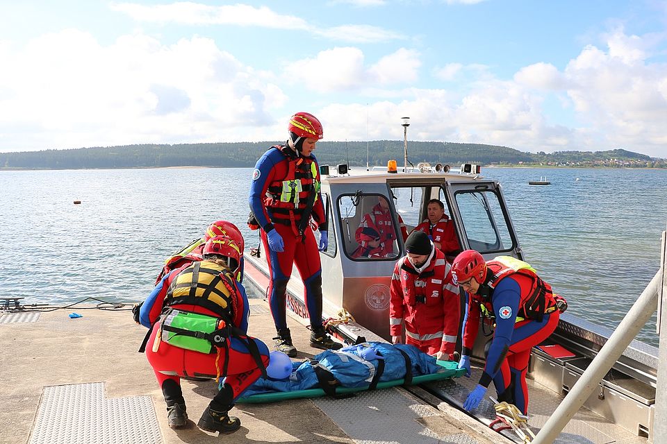 Ebenfalls mussten die Teilnehmer zeigen, dass sie die gängigen seemännischen Knoten sicher beherrschen und einen Patienten mit einer Schleifkorbtrage einen Hang hinaufziehen können. Zudem wurde auch das richtige Verhalten im Fließwasser geübt: Wie schwimme ich im Fließwasser? Wie lerne ich es richtig zu lesen? Wie überquere ich einen Fluss und welche Seilkonstruktionen kann man nutzen?