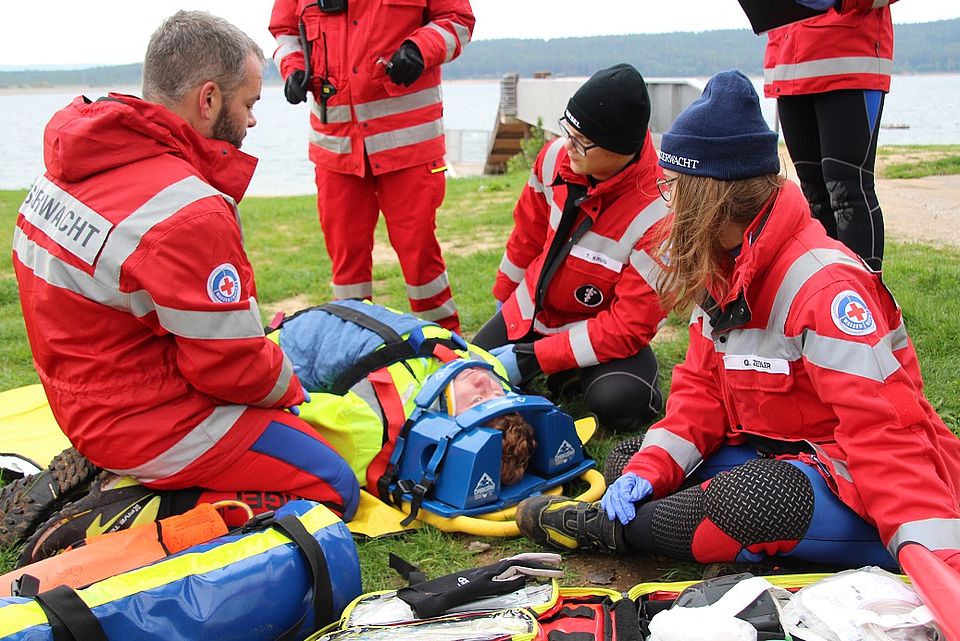 Besonders gut kam bei den Teilnehmern an, dass das Wochenende ähnlich wie bei echten Einsätzen aufgebaut war. Die Teilnehmenden hielten sich im Bereitstellungsraum auf, bis sie von unserem Einsatzleitwagen angefunkt wurden und ihren Einsatzauftrag erhielten. Wiederbelebung, Sturz vom Baum und Hitzeerkrankungen waren entsprechende Szenarien. Bei der Rettung eines verunglückten Tauchers oder der Rettung mit dem Motorboot mussten die Azubis ihr in der Theorie erlerntes Wissen anwenden. An weiteren Stationen ging es um ein vermisstes Kind an Land oder eine vermisste Person im Wasser. Hier wurde nach dem Eintreffen des Wasserrettungstrupps zunächst die Theorie vermittelt und ein gemeinsames Vorgehen besprochen, bevor der Einsatz abgearbeitet werden konnte.